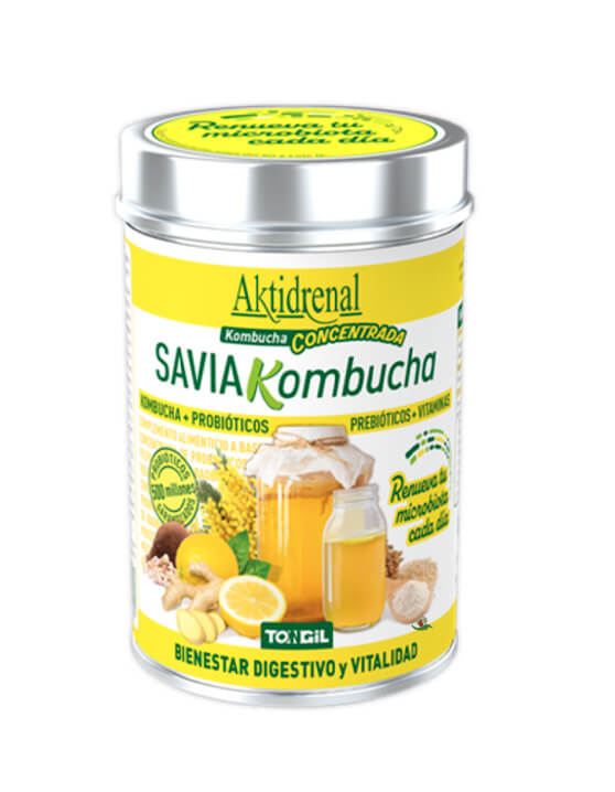 Aktidrenal Savia Kombucha de Tongil contiene una exclusiva fórmula a base de concentrado de Kombucha en polvo, 9 cepas de probióticos estabilizadas, fibra prebiótica procedente del fruto de Baobab y Acacia y vitaminas 100% vegetales procedentes de brotes de quinoa.