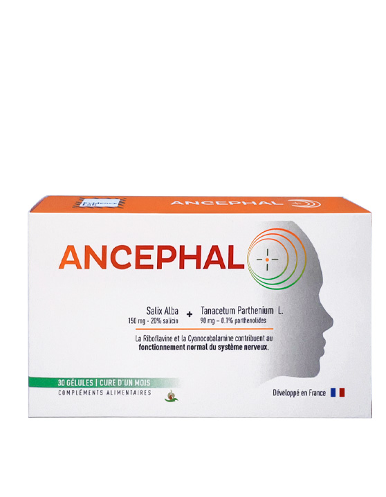 Ancephal es un complemento alimenticio 100% natural dedicado específicamente a la migraña. Está compuesto por una combinación de plantas inspiradas en la medicina alternativa, rigurosamente seleccionadas, tituladas con respeto y ricas en principios activos: partenólidos y salicina. Tras 20 años de investigación, Ancephal se ha sometido a un estudio clínico que demuestra su eficacia y no presenta efectos secundarios adversos, dependencia ni toxicidad*.