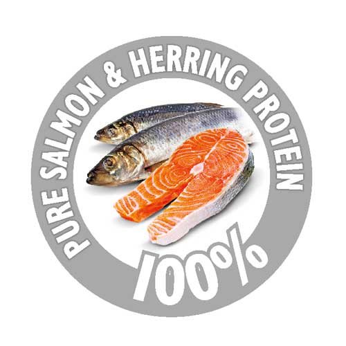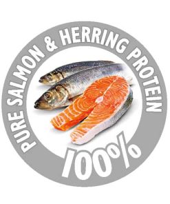 Salmón deshidratado (25%), proteína fresca de salmón (16%), arenque deshidratado (14%), guisantes amarillos, grasa de pollo (conservada con tocoferoles), garbanzos, linaza (4%), aceite de salmón (3%), alforfon ( fagopyrum esculentum ).
