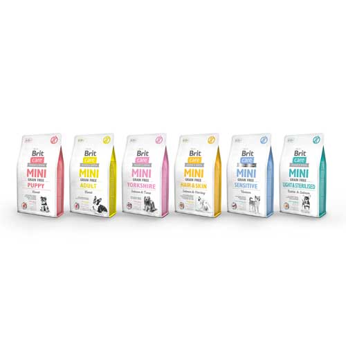 Brit Care ha creado una nueva linea de alimento para perros especialmente formulada para cumplir con los requisitos de razas pequeñas. No contiene cereales y tiene un alto contenido de carne, con sustancias funcionales que benefician al sistema inmunitario, condición física, corazón, pelo, piel, dientes y esqueleto de perros mini.