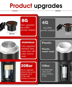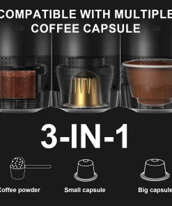 【Multicompatible】La máquina de espresso portátil 3 en 1 está equipada con un compartimento para café molido y un compartimento para cápsulas, que es compatible con cápsulas pequeñas y grandes y café molido.