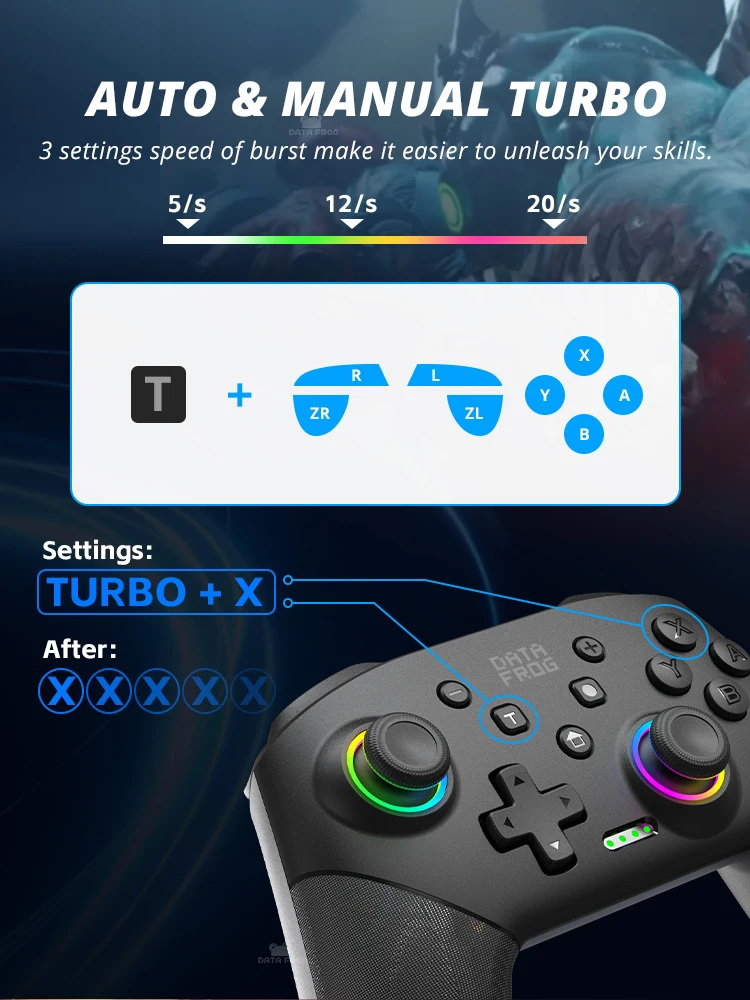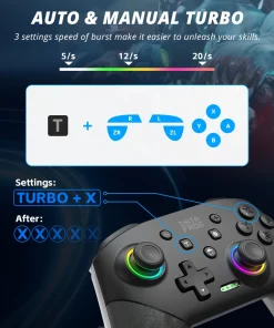 El diseño ergonómico y antideslizante del control remoto del controlador profesional te permite controlar el juego de manera estable y no tienes que preocuparte por el sudor en tus manos. El controlador de interruptor inalámbrico se puede configurar en modo TURBO automático o modo TURBO manual. Hay 3 velocidades ajustables: 5 disparos/s, 12 disparos/s o 20 disparos/s. También puede personalizar el botón TURBO, A/B/X/Y/L/ZL/R/ZR todos los botones se pueden configurar en TURBO, que facilitan ganar un juego de arcade o acción.