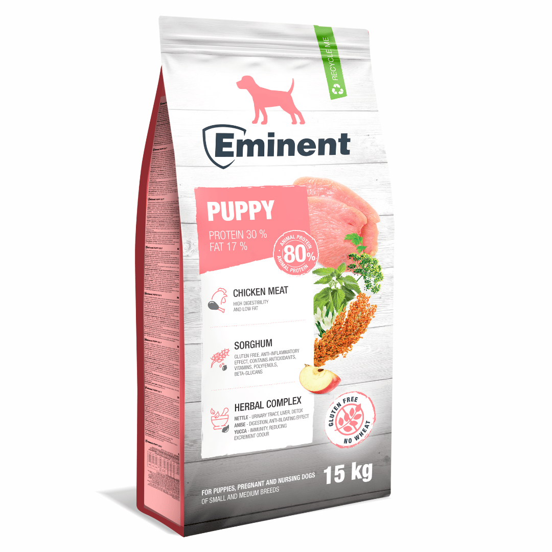 Ingredientes Eminent Puppy: carne de ave deshidratada (36%), maíz, grasa de ave, sorgo (8%), proteína de maíz, arroz, manzanas deshidratadas, hígado de ave hidrolizado, linaza, esquejes de azúcar, aceite de coco, MOS (mananoligosacaridos), FOS (fructooligosacáridos) , betaglucanos, complejo de hierbas (ortiga, anís, Yucca schidigera ), suplementos (vitaminas, oligoelementos, aminoácidos).