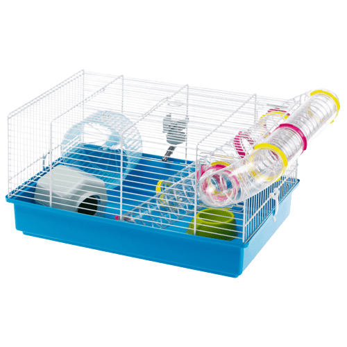 Está equipada con accesorios para roedores, incluyendo un iglú, un comedero, un bebedero y una rueda de plástico, así como tubos transparentes, dentro de los cuales su pequeño roedor puede correr y divertirse.