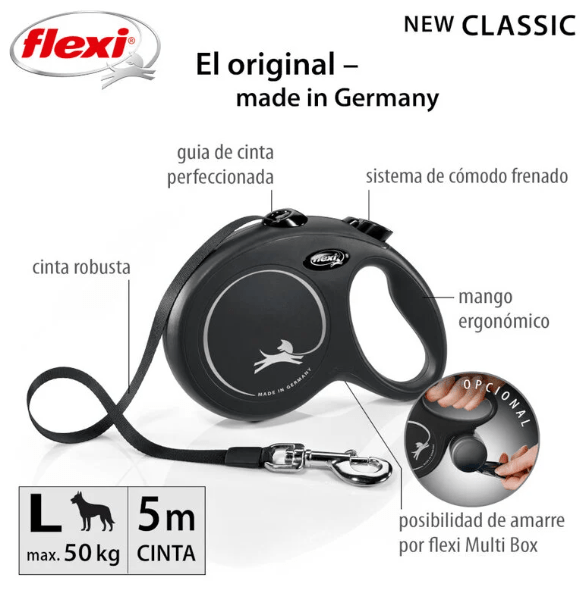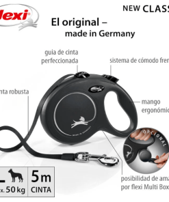 Un diseño de siempre, ese es el de esta correa de Flexi. Y es que a veces no hace falta nada más si te brinda seguridad. Su elegante color negro combina con su diseño simple. Pero lo mejor es que está fabricada en los mejores materiales, con toda la resistencia que necesitas para aguantar los posibles tirones de tu perro. Además, cuenta con un botón de bloqueo para que puedas frenar el avance de tu perro de forma cómoda.