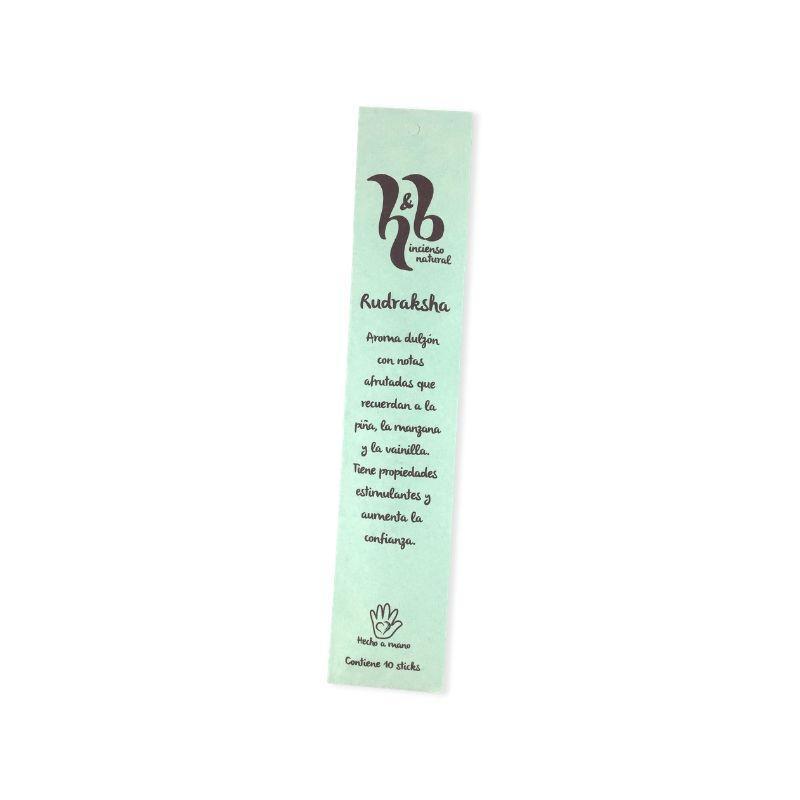 INCIENSO NATURAL RUDRAKSHA 10 STICKS H&B: Aroma dulzón, con gran personalidad y carácter. Fragancia de marcado carácter afrutado, floral y primaveral. Ayuda a levantar el ánimo, despierta las pasiones y favorece los estados de alegría. Este aroma ha sido desarrolado basándose en nuestra antigua fragancia Everest. a la base de canela y rododendro le hemos añadido notas afrutadas como la piña y la manzana, lo que le confiere un aroma de notas envolventes y muy aromática.
