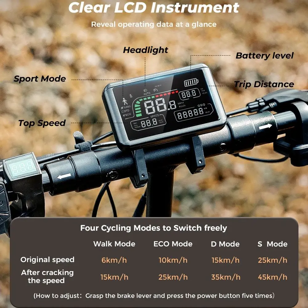 - 4 Rding Modes: 6/10/15/25 KM/H(After crack: 15/25/35/45 KM/H)