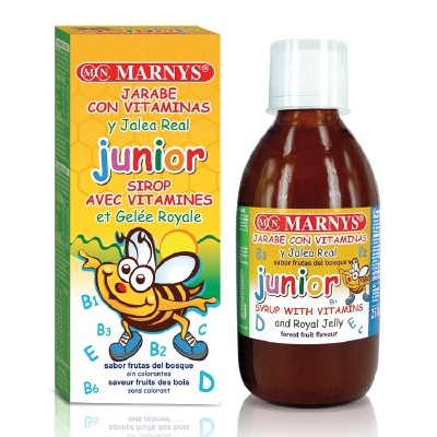 MARNYS® JUNIOR es un jarabe multivitamínico con jalea real y agradable sabor a frutas del bosque, con vitaminas A, C, tiamina (B1), riboflavina (B2), niacina (B3), ácido pantoténico (B5), B6, B12, D, E, ácido fólico y biotina. La jalea real es una mezcla de polen, néctar y enzimas producidas por las abejas obreras, siendo el único alimento mayoritario de la abeja Reina.