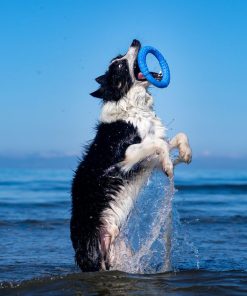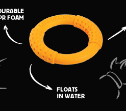 El aro mini de Kiwi Walker es un juguete versátil para perros. Es ligero y flota, lo que lo hace perfecto para jugar dentro del agua pero el TPR de alta densidad hace que sea muy resistente y duradero, además de rebotar al golpear contra el suelo por lo que pueden jugar a lanzar y recoger fuera del agua. El tacto de este material es suave y no daña las encías del perro. El relieve de este aro hace que les sea fácil agarrarlo y no les resvale en la boca.
