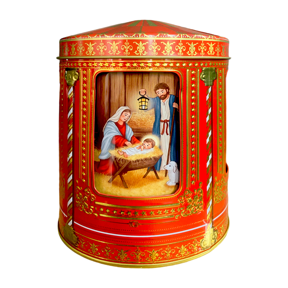 Ingredientes lata carrusel musical belén nacimiento: COBERTURA. Chocolate con leche (45%), azúcar, manteca de cacao, leche en polvo entera, pasta de cacao, emulgente (lecitina de soja), aroma natural. Cacao mínimo 30%. RELLENO. Crema de avellanas (55%), azúcar, grasas vegetales (coco, palmiste, palma, girasol, karité y colza) en proporción variable, suero de leche en polvo, cacao magro en polvo, avellana (1%), emulgente (lecitina de soja), aroma natural.