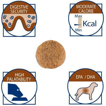 Royal Gastro Intestinal Moderate es un alimento completo, dietético con niveles moderados de energía y grasas para mantener el peso óptimo del animal.