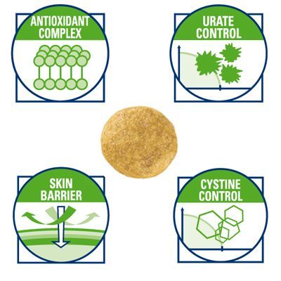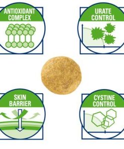 La combinación de cantidades moderadas de proteínas de alta calidad con niveles restringidos de sodio contribuyen a reducir la formación de cálculos de cistina. El complejo antioxidante sinérgico (Vitamina E, Vitamina C, luteína, taurina): – Limita la degradación celular provocada por los radicales libres. – Fortalece el sistema inmune y previene los efectos del envejecimiento.