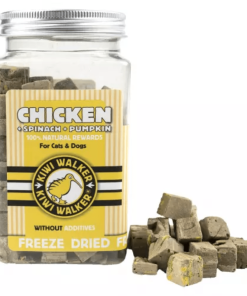 Snack Kiwi para mascotas (Pollo y Calabaza), las golosinas liofilizadas se preparan sin cocinar , por lo que conservan todas las propiedades naturales de los ingredientes individuales , así como el delicioso sabor de los ingredientes frescos.