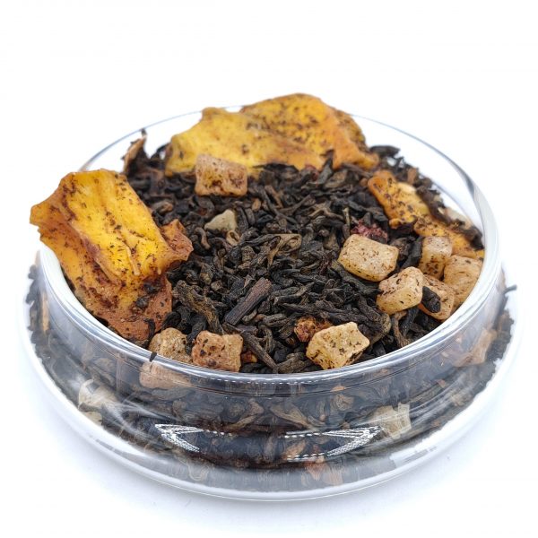 Ingredientes té rojo mango fresa: Te rojo Pu Erh, trozos de fresa, trozos de mango, mango confitado y aromas de fresa, mango y vainilla.