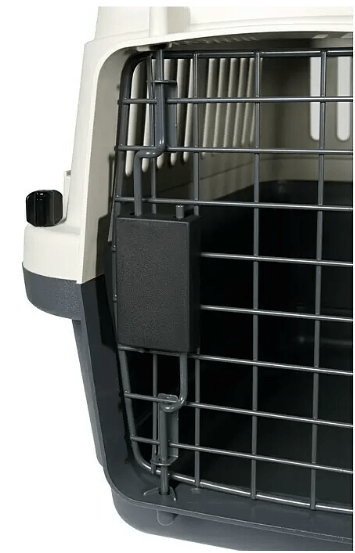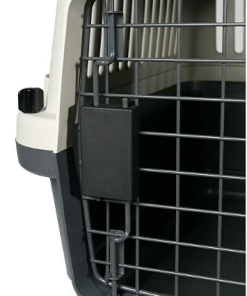 Respiradero por los cuatro lados para garantizar una correcta ventilación del transportin, puerta metálica con cierre de seguridad y con comedero interior.