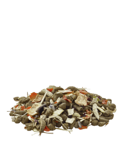 subproductos de origen vegetal (fleo de los prados y hierbas 23%), hortalizas (guisantes verdes 12,5%, zanahorias 6,3%, chirivía 2,6%), frutas, semillas, sustancias minerales, extractos de proteínas vegetales, aceites y grasas, FOS, caléndula, MOS, algas, yuca